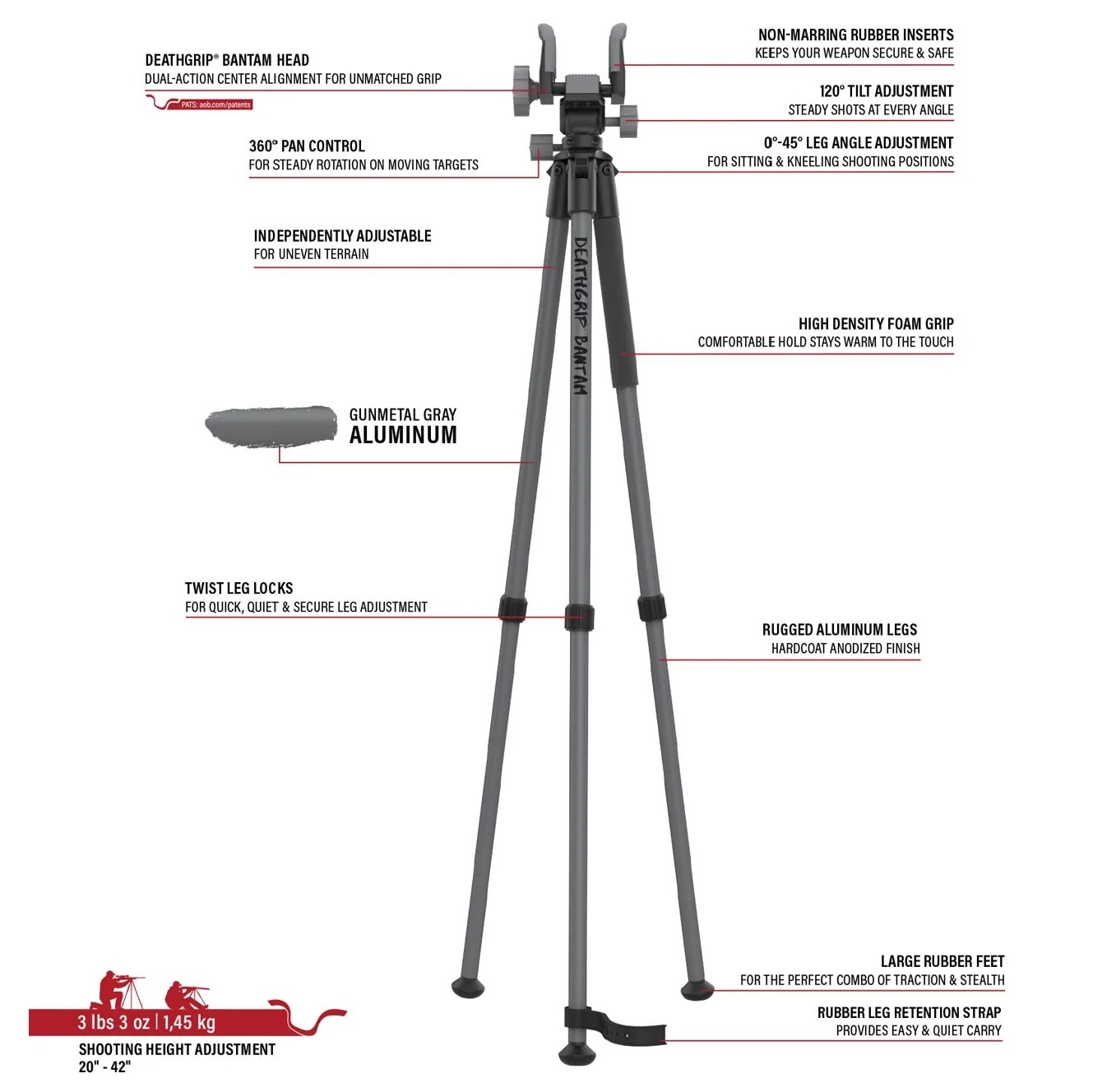 Featuring the world-renowned dependability of its big brother the original BOG DeathGrip tripod, the DeathGrip Bantam is designed for situations where a more compact, lightweight tripod is needed. Weighing in at just over 3 lbs, the DeathGrip Bantam is up to 44% lighter than the competition, putting it in a weight class all its own. Featuring sitting to kneeling shooting, a maximum holding weight of 40 lbs, and a price tag up to 50% less than the competition, the DeathGrip Bantam is a tripod that punches above its weight class!