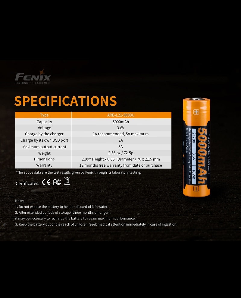 ARB-L21-5000U USB rechargeable 21700 Li-ion battery, sufficient power, steady performance, the capacity of the 21700 battery is twice as powerful as the common 18650/2300mAh battery. Which provides the lighting tools with sufficient power and longer duration. Multiple protection, ensure the use safety and good performance of the battery; Steel shell riveting technology, fully protected the battery against damage; Pressure relief vents, rapidly expel internal gas.