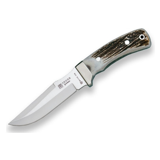 The Joker Gamo Hunting Knife has been manufactured under the Denomination of Origin of Albacete (Spain). It is the perfect sporting knife for your hunting sets, at the same time that it is ideal and very useful for camping, hiking, bushcraft etc. The Joker Gamo sporting knife is made of a full tang blade made of Mova 1.4116 stainless steel with a blade length of 13 cm, blade width of 3.2 cm and a thickness of 3.7 mm. The length of the handle is 11.5 cm and it is made of Stag horn. The Joker Gamo knife is accompanied by a premium leather sheath in brown color.