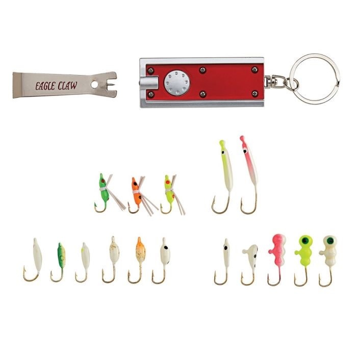 Ice glow jig kit with a charging light, line clipper with eye cleaner, and a variety of glow ice jigs