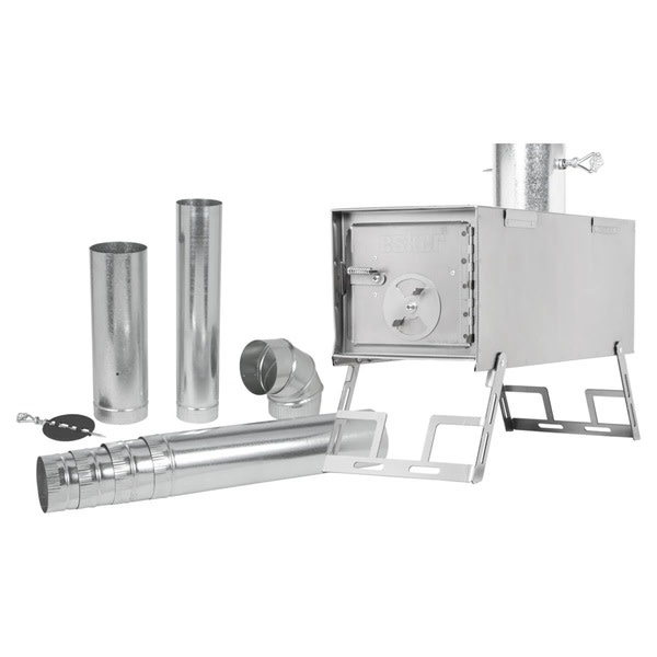 Introducing the Esker Ontario 2 Winter Tent Stove by Kni-Co. Designed for use in tents where an elbow is required for angled pipe stacks, the Esker Ontario 2 stove features nesting galvanized pipes and a stove box on Esker’s specially designed snow float legs for stabilizing the stove with branches or poles. All stove pipes stow inside the stove box and Esker legs fold up for light and easy transport. The included damper and air intake control on the stove door makes burn rate and temperature regulation a breeze. The 22 gauge cold rolled steel makes for a functional, lightweight yet sturdy stove to help you make the most of your Canadian winter outdoors.