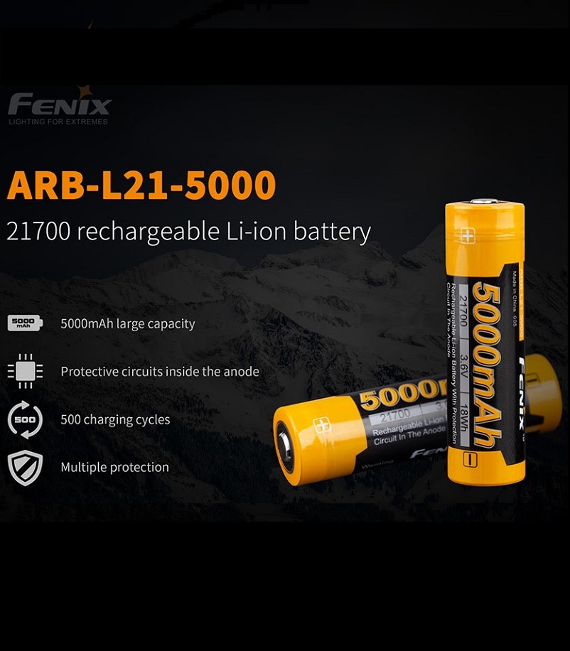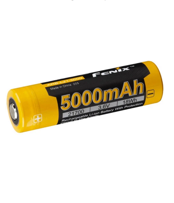 Since the release of the Fenix PD36R and TK22V2, everyone has been patiently waiting for the release of spare batteries. The time has come; now available is the Fenix ARB-L21-5000 rechargeable 21700 battery. The all-new Li-ion battery provides the voltage and power needed for extended runtime and higher lumen capacities. The ARB-L21 comes with all the bells and whistles of high-quality Fenix batteries, including protective circuits inside the anode and up to 500 charging cycles. Also included are the three sets of overheat protection: pressure relief, microporous, and PTC cathodal block. Don't run out of light; pick up a spare 21700 battery today! THIS BATTERY IS NOT AN 18650, AND IT IS NOT COMPATIBLE WITH 18650 FLASHLIGHTS OR OLDER STYLE CHARGERS. COMPATIBLE CHARGERS ARE THE ARE-A2, ARE-A4, ARE-D1 OR ARE-D2. This is not the version of the battery with the direct USB charging. For the 21700 battery with Type-C charging click here. Specifications 500 Recharge Cycles 5000 mAh Capacity Lithium-ion rechargeable Multiple Layers of protection Pressure Relief Valve Protection Separate Microporous Protection PTC Cathodal Protection Protection Circuits in the anode Overcharge Over-discharge Short Circuit Overheat Protection 7.5a Maximum current Steel Shell Riveting 3.6V Charging Current: 1A recommended, 5A Maximum Note: Does not include an on-board USB port for direct charging Size Weight: 2.56 Ounces Height: 2.99" Diameter: 0.85"