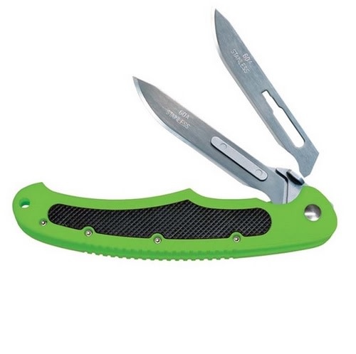 ● 12 additional stainless steel 60A blades, 2-3/4”● Rugged ABS shock-green handle● Black rubber grip insert● Overall length 7-3/8"● Ambidextrous thumb studs● Open back for easy cleaning● Liner-lock construction● Removable holster clip● Black nylon holster● Fits all Piranta style blades