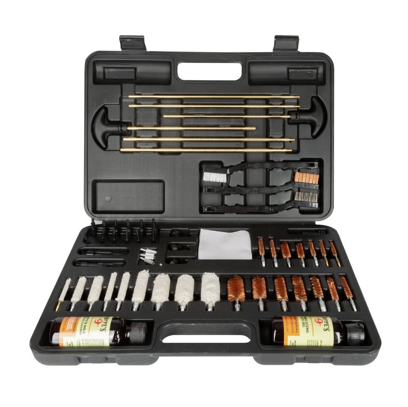 This 62-piece cleaning kit contains everything you need to need to keep firearms spotlessly clean. Traditional Hoppe's No. 9 Bore Cleaner, Lubricating Oil and full-size brass rod and components keep pistols, rifles, and shotguns clean. All parts are contained in the durable, reusable locking tab carrying case.
