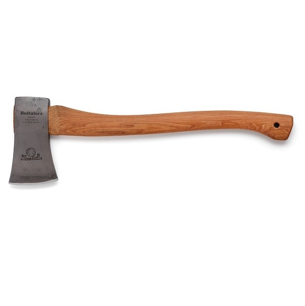 A small axe for outdoor use in forests and open land. Made from blasted and clear-lacquered ironwork, it is also suitable for work in the garden. The shaft is curved and made from hickory. An edge protector is included.