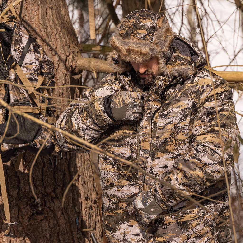 Made for the worst of Mother Nature. A 100% windproof and waterproof construction is the framework for the men's Fairbanks heavyweight hunting jacket in Disruption. This jacket is built to handle every cold, wet, and snowy hunting season.