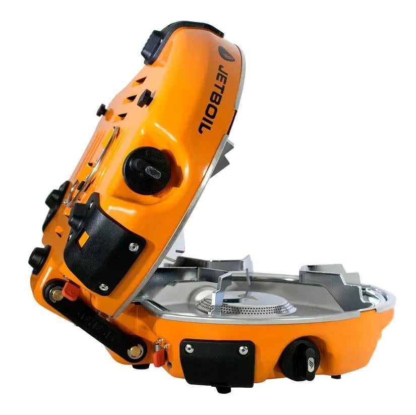 The award-winning Genesis Basecamp System is the ultimate all-in-one backcountry cooking system, stowing neatly into itself and fitting snugly among your gear. Jetboil's dual-burner design functions as a standalone stove, or couples with other JetLink-compatible stoves or a Luna Satellite Burner to create an outdoor cooking range. The system's 5-liter Jetboil FluxPot and 10-inch ceramic-coated nonstick fry pan give you everything you need to set a new benchmark for basecamp cooking. A beastly 10,000 BTU heating system boils water in just over three minutes—perfect for melting snow or making coffee. An attachable windscreen improves the system's performance in any weather; regulated for consistent performance down to 20 degrees F (-6 degrees C). Includes system carrying bag with pocket for regulator; compatible with standard 16.4-ounce propane bottle; weighs 9.1 pounds.