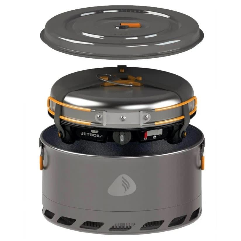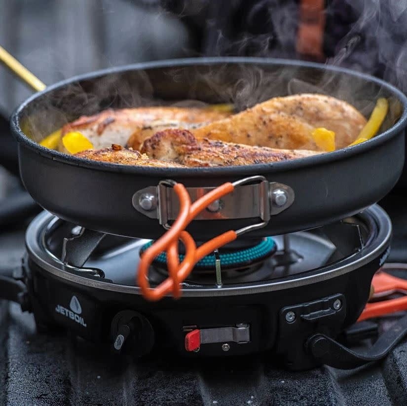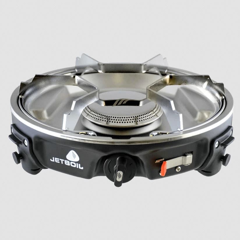 Retrofit your backcountry repertoire with the HalfGen, the world's first modular, expandable basecamp cooking system. Use the HalfGen as a standalone stove, or couple it to other JetLink-compatible stoves to create an outdoor cooking range. A beastly 10,000 BTU heating system boils water in just over three minutes—perfect for melting snow or making coffee. Jetboil's proprietary regulator technology offers incremental heat adjustments from light simmer to full boil. The system's 9-inch ceramic-coated fry pan offers nonstick performance for eggs, pancakes, burgers, and more. Compatible with 5-liter FluxPot (not included); regulated for consistent performance to 20 degrees F (-6 degrees C); weighs 3.5 pounds. One-year limited warranty. For any adventure—from alpine expedition to a weekend trek—Jetboil offers a stove that will keep you fueled. When exploring the backcountry, a compact and efficient stove is fundamental, no matter the level of cuisine you want to create.