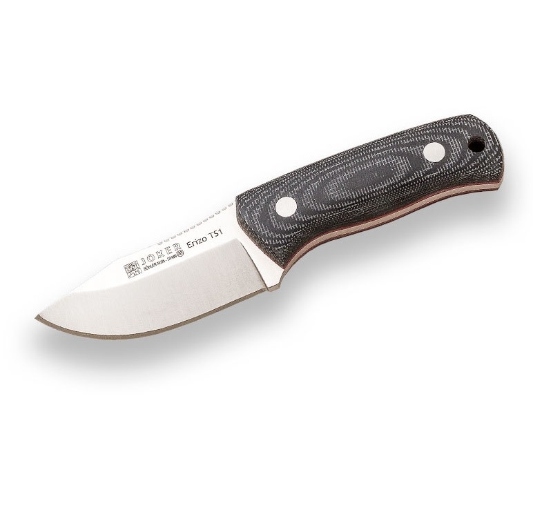 Hunting and bushcraft knife Joker ERIZO TS1 / Neck knife and belt. Steel: Böhler N695 Handle: Canvas Micarta Verde. Blade length: 7.5 cm Blade thickness: 4 mm Weight: 135 gr. Sheath: Kydex. Includes 1.30 meters of paracord 550.