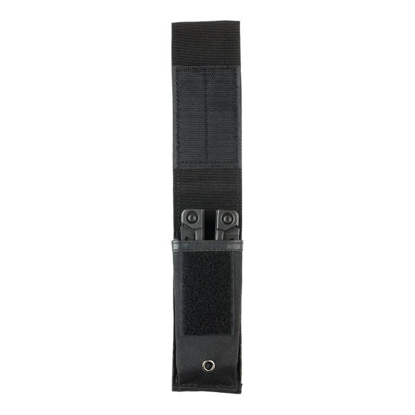 A nylon MOLLE system sheath featuring a snap webbing strap for attachment on backside.