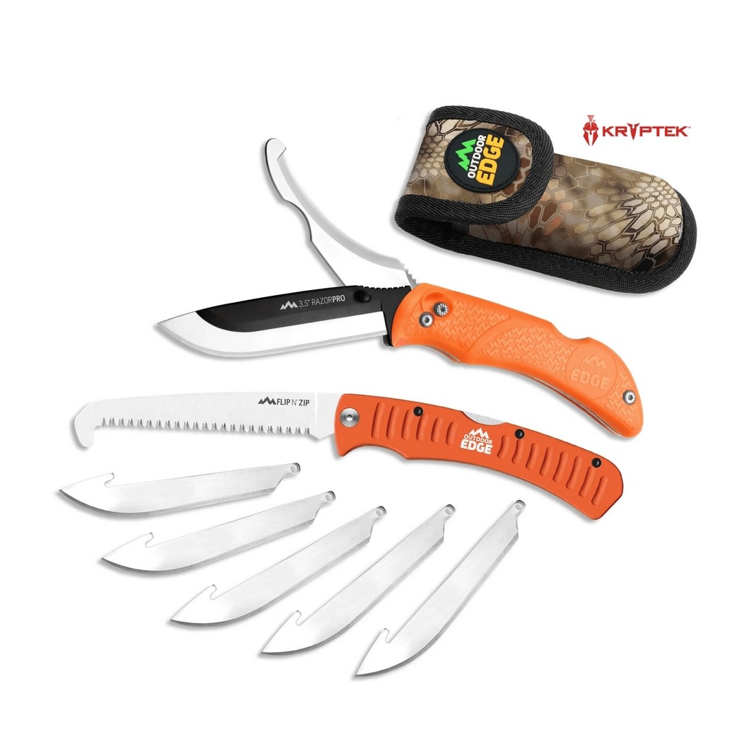 The black-oxide coated blade holder supports the razor-blade for the strength of a standard knife and sharpness of a surgeon’s scalpel; and the blades change safely and easily at the push of a button. Our signature gutting blade cuts underneath the skin without cutting hair or piercing internal organs. Both blades open and close independently with one hand and lock securely. Rubberized blaze-orange TPR handles ensure a safe, non-slip grip, even when wet. Also includes a 4.4" aluminum handle folding saw with triple-ground tooth pattern for penetrating tough bone and wood. Comes complete with six 3.5" Japanese 420J2 stainless replacement blades and a Kryptek Highlander camo sheath with pockets to hold the knife, saw and spare blades. Replacement packs of 6 blades sold separately.