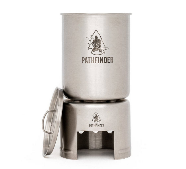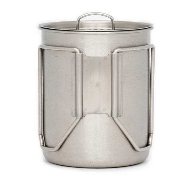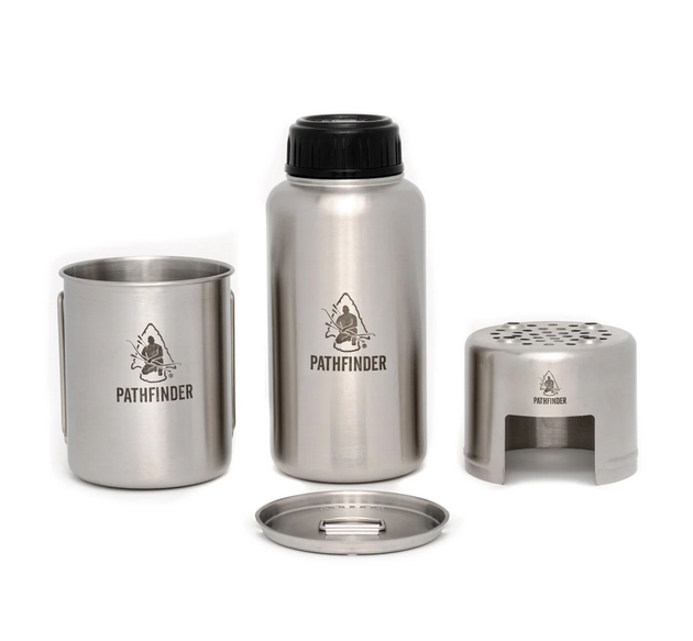 This Stainless Steel Bottle Cook Set is an ideal camping companion. Its unique design allows it to be stored compactly and securely. It also has a wide-mouth lid, giving you access to shallow water sources. The Single Wall construction makes it durable enough to withstand direct fire and to be placed in coals for boiling/disinfecting water.