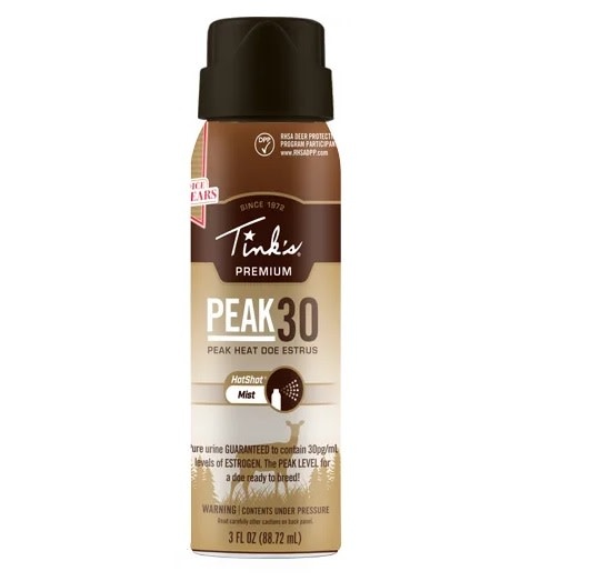 Each collection goes through a scientific certification process to guarantee levels of estrogen present. Tink’s Peak30 Peak Heat Doe Estrus is the most premium estrus deer urine on the market. Available in 3 oz. Can
