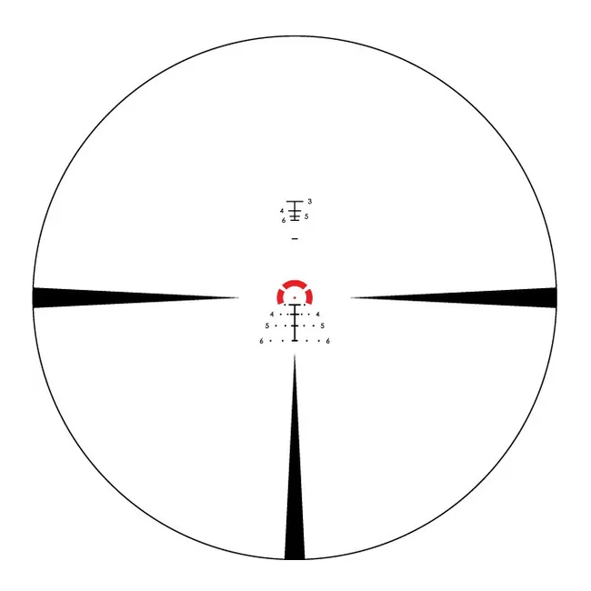 A first focal plane reticle is located within the riflescope near the windage and elevation turrets. The scale of reticle remains in proportion to the zoomed image. Constant subtensions allow accurate holdover and ranging at all magnifications. The reticle’s size will appear larger at high magnifications and smaller at low magnification.